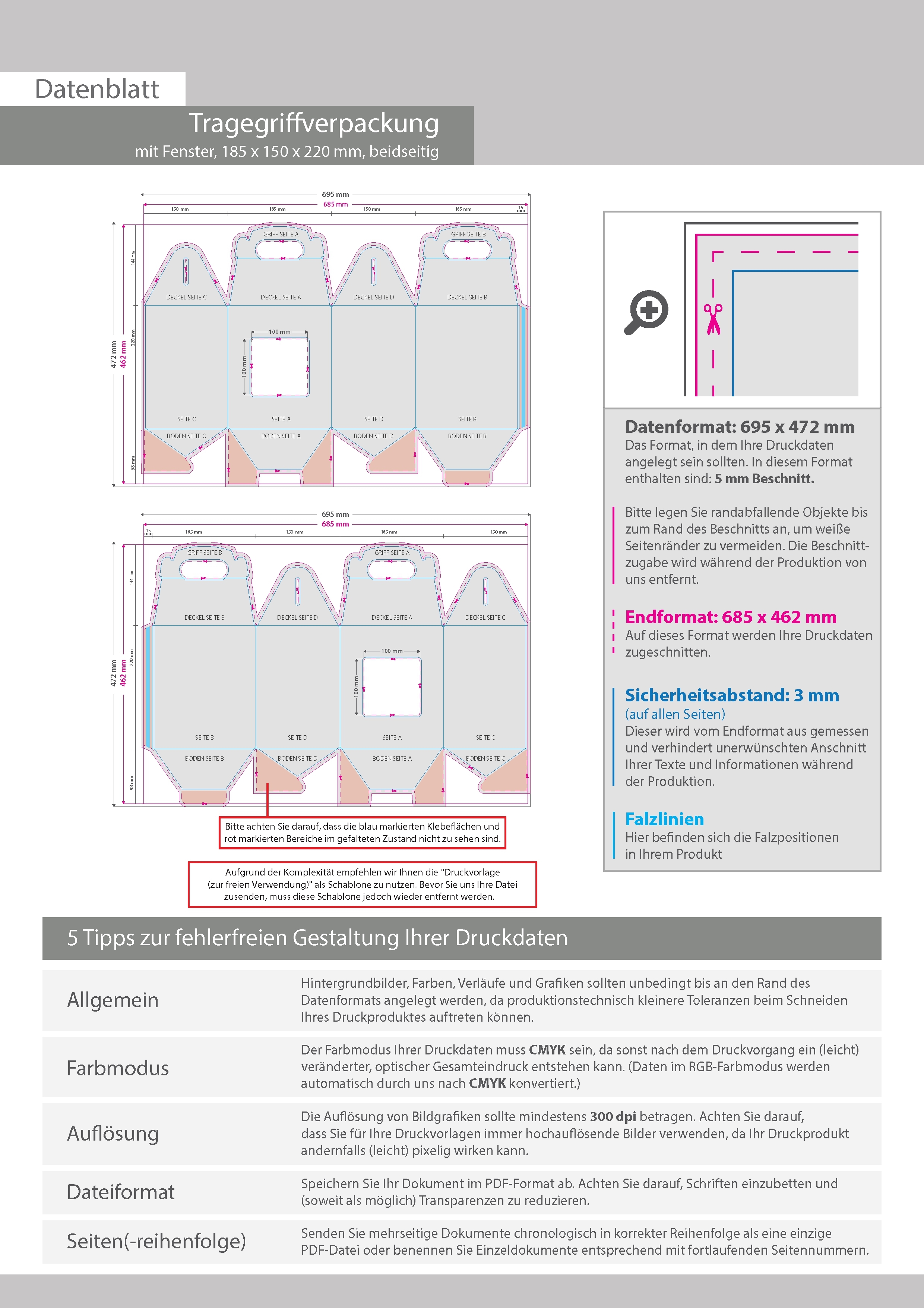 Tragegriffverpackung (18,5 cm x 15 cm x 22 cm) beidseitig bedruckt 4/4-farbig mit geklebtem Fenster
